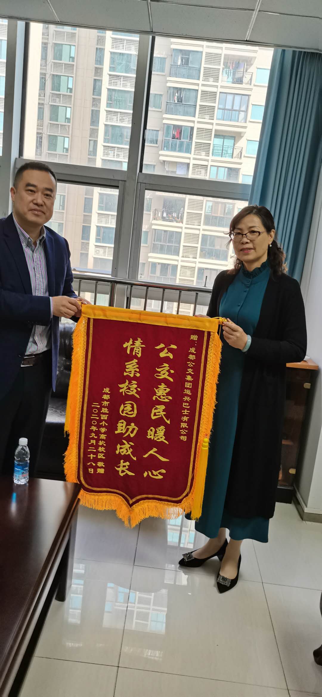 最后,陈燕校长和郭亮副校长为成都公交集团运兴巴士有限公司、207车队送上锦旗,表达全体师生、家长的感谢。学校表示,希望和公交公司建立长期友好的互动,今后还能开展更多有意义的活动。