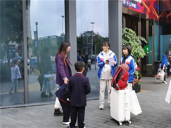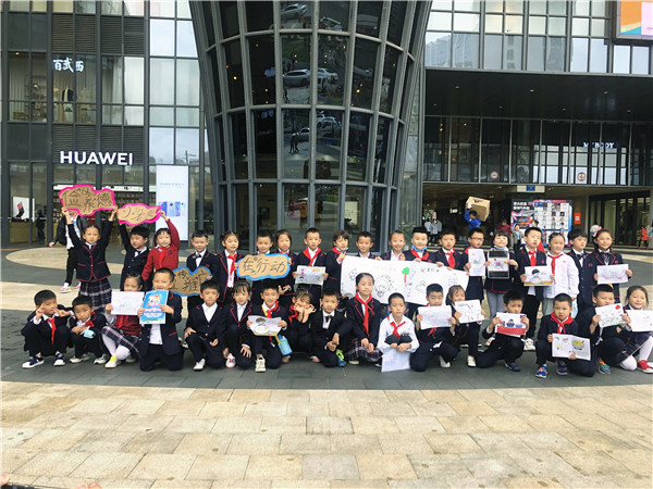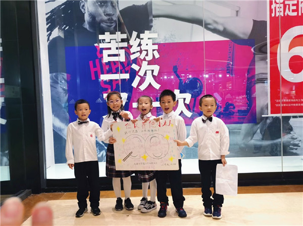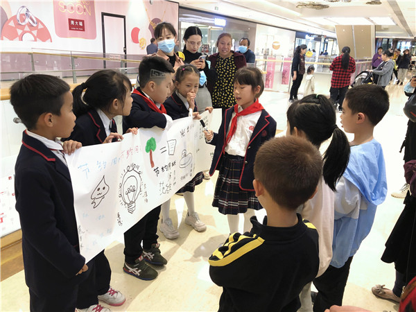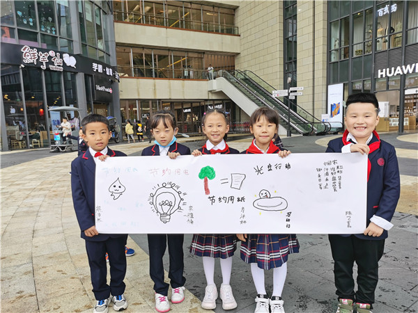 周末的龙湖北城天街,人来人往,一群身着实小北新校服,高举“勤俭节约”宣传海报的小学生成为了商圈内最亮丽的风景线。