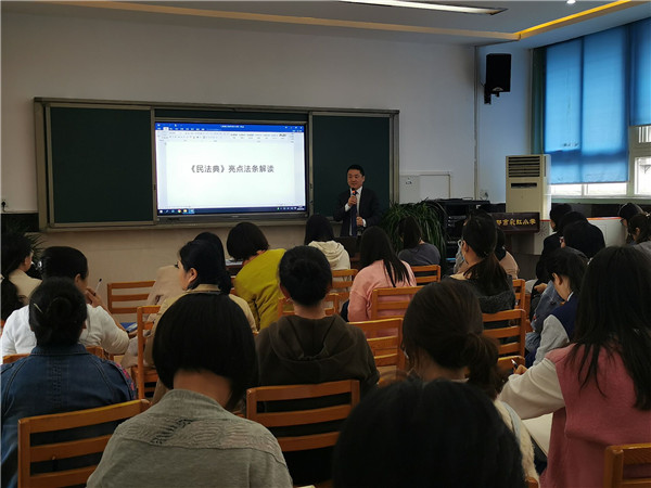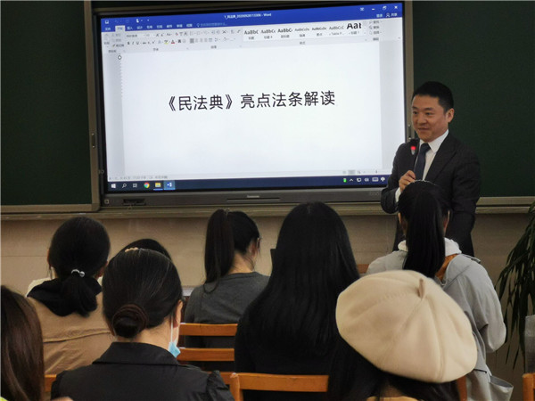 王雷律师向老师们介绍了《民法典》编纂的历史沿革和重要意义,并对民法典物权编、人格权编、婚姻家庭编、继承编、侵权责任编等各编进行了深入、详细的解读。