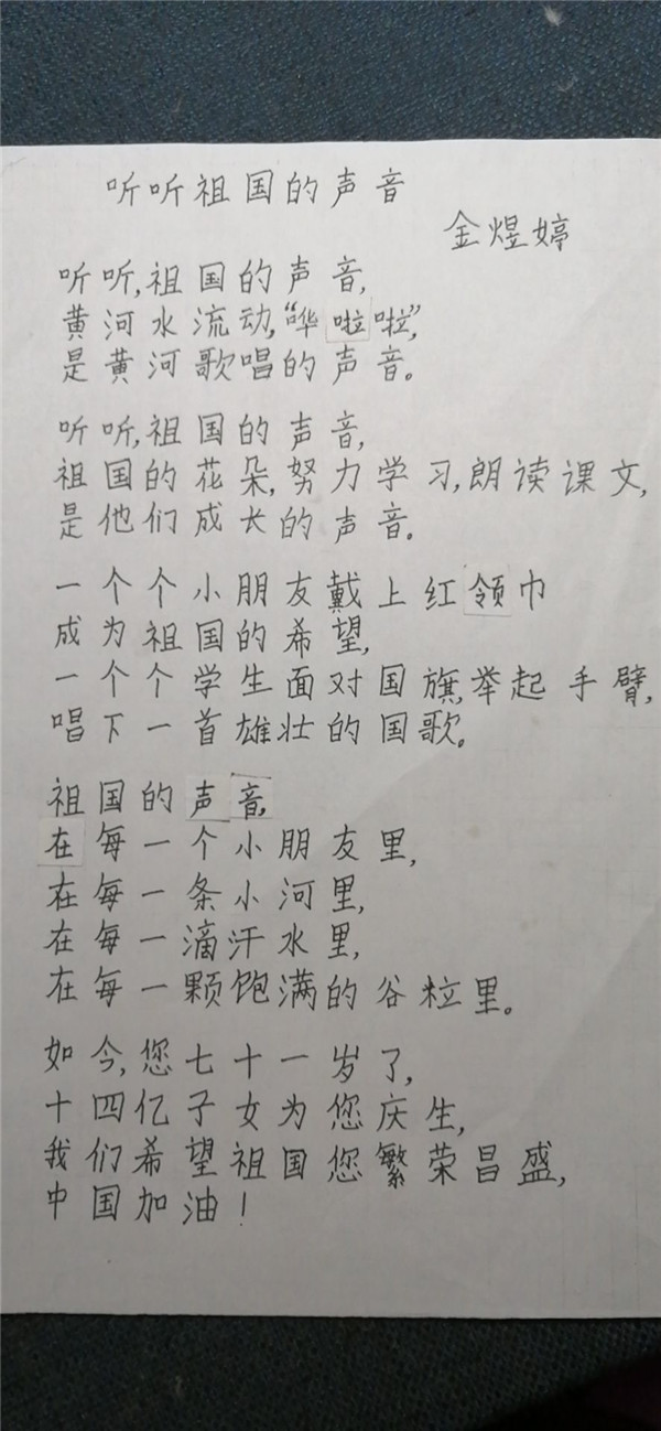第三阶段的活动在国庆假期中展开。学校组织学生和家长,以“祖国妈妈,我为你写诗”为主题开展亲子诗歌创编活动,通过原创诗歌,为祖国妈妈点赞。一首首小诗里,有祖国壮丽的大好河山,有祖国秀美的人文风光,更有祖国日新月异的巨变,饱含了每一个人对祖国妈妈的美好祝愿。