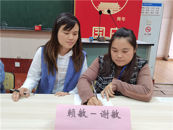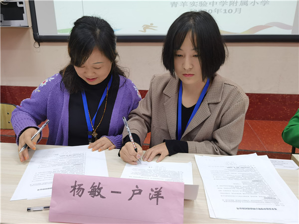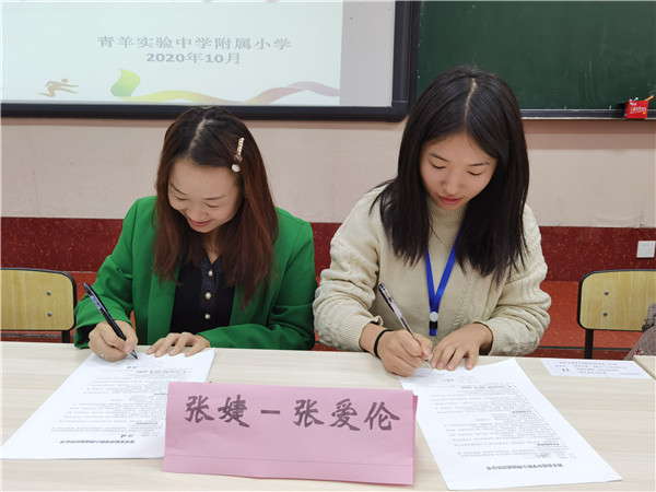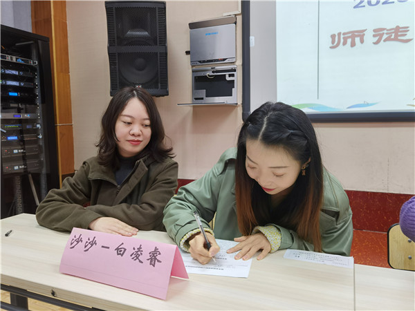接着,师徒代表上台签署协议,郑重许下承诺:“今天起,师父引领徒弟前行,徒弟跟随师父成长”。一纸聘书,是责任,是祈盼,未来的教学之路,师徒携手并肩,共同美丽。