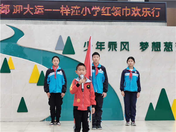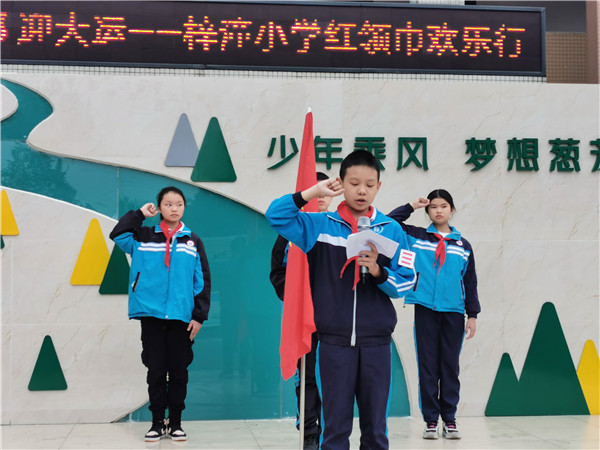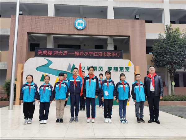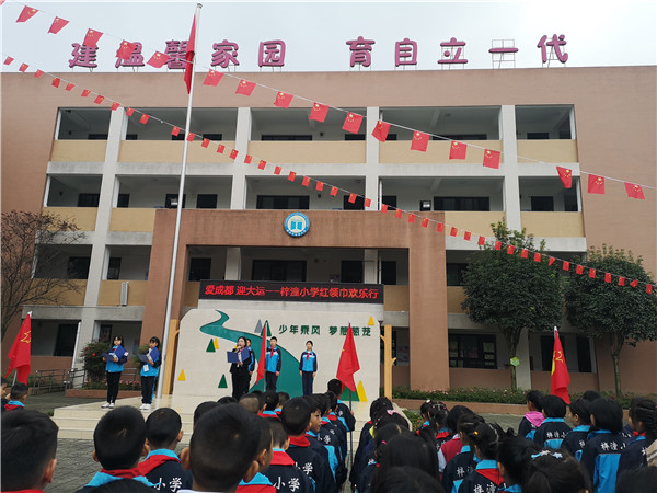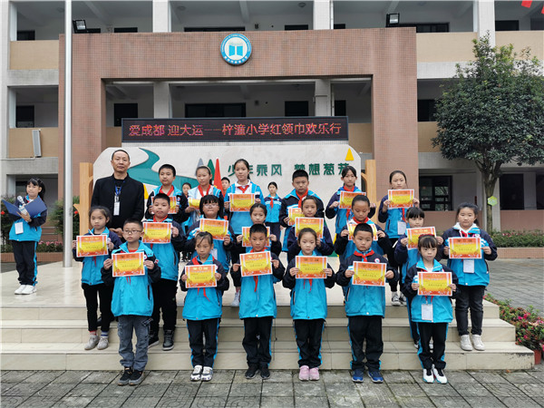 10月13日上午,梓潼小学全体师生在前操场开展了“爱成都·迎大运——红领巾欢乐行”建队节纪念活动。活动在雄壮有力的出旗曲中拉开序幕,少先队员们敬队礼,向队旗致敬。接着队员们齐唱中国少年先锋队队歌,学生代表为全体教师佩戴了红领巾。