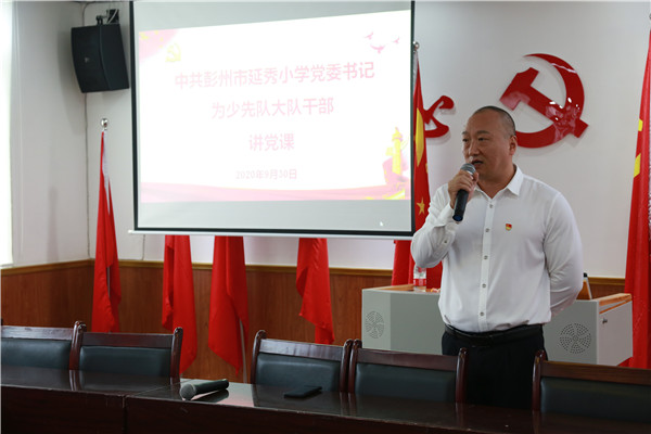 为贯彻落实习总书记关于“少先队要高举队旗跟党走,传承红色基因,培育时代新人”的重要指示精神,落实共青团中央、教育部、全国少工委下发的《关于深入贯彻落实党建带团建、队建 加强少先队工作体制机制建设的意见》,全力打造“秉启华之志 育红星少年”的党建带队建品牌,在少先队建队71周年之际,彭州市延秀小学党委书记、校长、党组织书记工作室领衔人周伟为延秀小学全体少先队大队委上了一节意义非凡的党课。