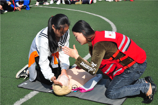 首先,区红十字会的工作人员结合理论知识和实际救护技巧对突发状况急救、徒手心肺复苏等内容作了详细地讲解。接着工作人员和现场师生展开了深入互动,对心肺复苏和急救包扎进行了实操演练并向同学们传授了急救手法和注意事项,让学生更深入地了解了各项救护技巧、掌握心肺复苏要领。