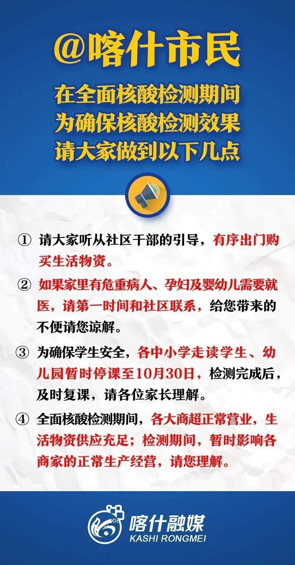 为确保学生安全,各中小学走读学生、幼儿园暂时停课至10月30日,检测完成后,及时复课。全面核酸检测期间,各大商超正常营业,生活物资供应充足;检测期间,暂时影响各商家的正常生产经营。