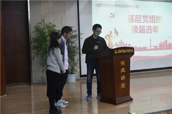 大会第二项议程为郑磊同志对实小明道分校新一届中共成都市实验小学明道分校支部委员会换届选举筹备工作作说明。郑磊同志特别强调,《关于中共成都市实验小学明道分校支部委员会换届选举工作的请示》是在充分酝酿下一届支委候选预备人选的基础上经支委会和行政班子讨论而制定,并宣读了《青羊区教育局党委关于同意成都市实验小学明道分校党支部进行换届选举的批复》,说明委员实行差额选举,书记实行等额选举,拟确定李衡为书记候选人预备人选。