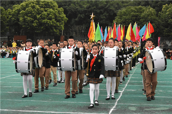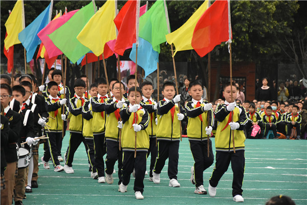 上午9时,运动会开幕式正式开始。主持人话音刚落,国旗方阵踏着整齐的步伐步入会场。接踵而来的是首次亮相的茶小鼓号队,漂亮的队形,嘹亮的号声,清晰的鼓点节奏,赢得了同学们的阵阵掌声。彩旗方阵绕操场一周,面面彩旗迎风飘扬,红的似火,粉的似霞,黄的似云,蓝的如潮,五颜六色,喜庆而又热烈。