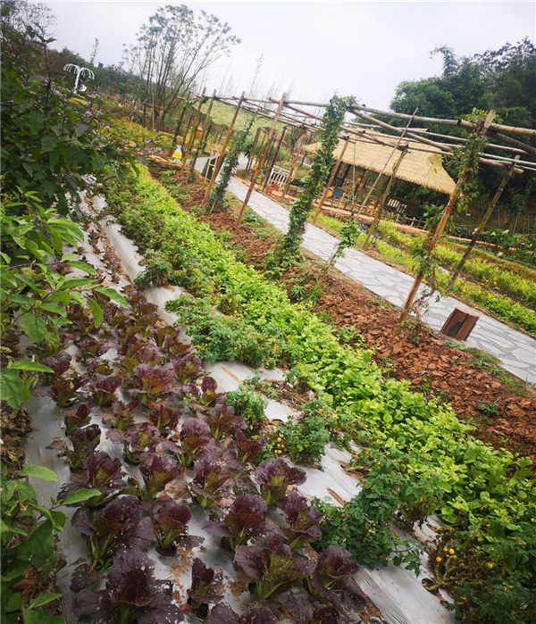 有序进入大门后,沿着“欢迎之路”就走进了“多彩农田”。首先跃入孩子们眼帘的是一片结满果实的农田。既有圆形的辣椒,红彤彤的像一个个小灯笼,还有尖尖的紫辣椒,成熟得已经发黑了;翠绿的冬瓜沉甸甸地挂着,孩子们说像个穿着绿衣裳的小胖子;还有不穿“紫衣”穿“黄袍”的茄子,紫色的农田,舒展着枝叶的牛皮菜,结满籽的向日葵……各种各样的瓜果蔬菜粮食,让孩子更好地触摸到大自然。