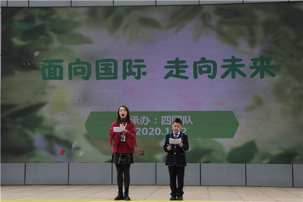 为认真落实学校的国际化建设,增进学生对不同文化背景、不同种族、不同宗教信仰的了解,促使每个学生都能通过对世界的进一步认识来了解自己、了解他人;学会尊重、了解其他国家、民族、地区的文化,探讨全人类共同价值观念,做一个充满爱慧品质的新时代接班人,成都市海滨小学第四团队于2020年11月2日上午进行了“面向国际 走向未来”主题朝会活动。