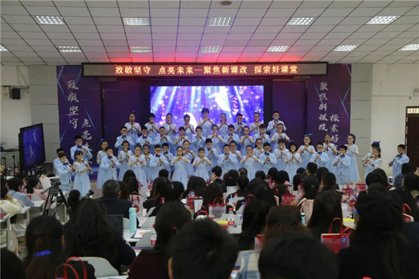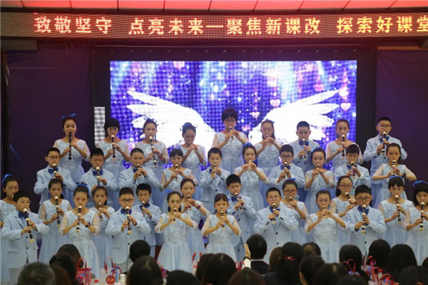 磨子桥小学木笛社团的孩子们在音乐组三位老师的带领下,为参会老师带来了精彩的木笛表演。《茉莉花》《隐形的翅膀》,淡蓝素雅的礼服,悠扬清纯的木笛声,孩子的表演让参会老师沉浸在优美的音乐声中。