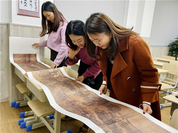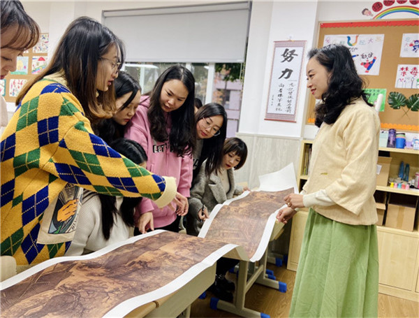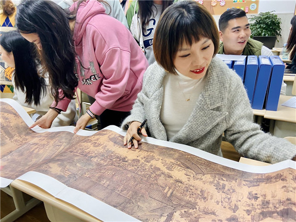 在对《清明上河图》做了简单的介绍之后,赵老师打开了这幅被誉为“北宋生活百科全书”的画卷,老师们都迫不及待地凑上前去,一寸一寸仔细观赏,不放过任何一个细节。它五次进宫,四次被盗的传奇故事,更是耐人寻味。