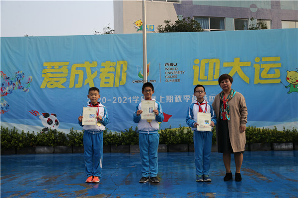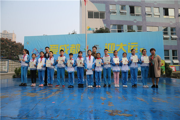 颁奖环节在轻快的旋律中拉开序幕。AB两区校领导们为孩子们颁发“毛里求斯第二十六届世界和平书画展国际青少年书画奖”世界和平奖、特别金奖及金奖。学校美术组秦伟、赵珊、朱玲、余倩、陈蕾、曾季珊、黎云靥、罗佳老师获得优秀园丁奖。此外,该校篮球代表队在青羊区中小学球类运动会中荣获第一名、足球代表队在青羊区中小学球类运动会中荣获二等奖。