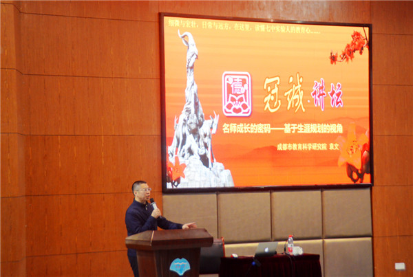 11月10日下午,成都市教育科学研究院教师发展研究所袁文所长走进七中实验“冠诚讲坛”,为老师们带来基于生涯规划视角的专题讲座《名师成长的密码》。
