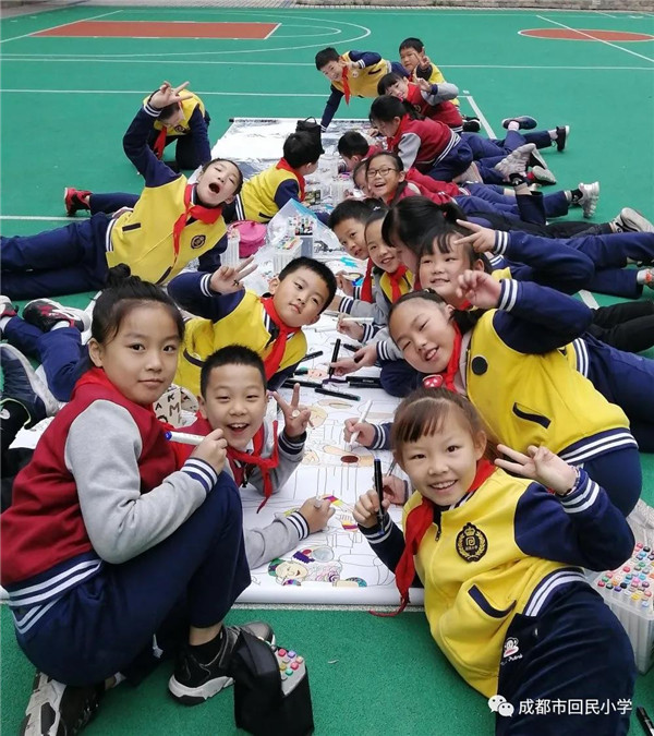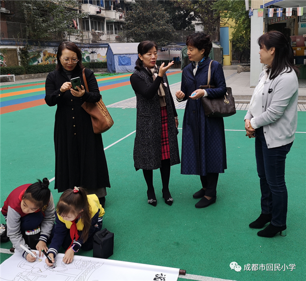 来宾们首先在学校前操场参观说唱俑美术组精心设计的“我给陶俑穿衣服”和“说唱俑游成都”相结合的“描说唱俑”画卷。三年级孩子们在老师的组织下安静有序地挑选好自己喜欢的陶俑位置,用充满想象力的彩笔为它们“穿”上色彩斑斓的衣服。一个个原本黯然无光的陶俑经过孩子们的创造变得栩栩如生,富有生机活力。