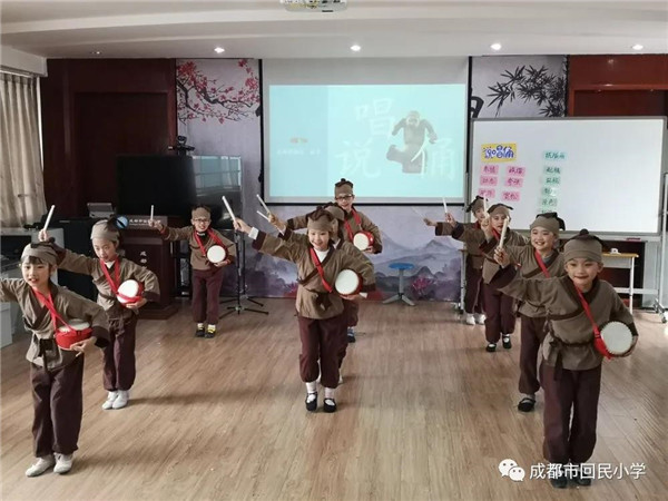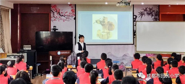 说唱俑课题不但涉及传统学科,回民小学学生们还用舞蹈、黄铜浮雕、画卷等新的表现方法来呈现。舞蹈社团的孩子们用肢体语言来表达他们对“说唱俑”的喜爱之情。来宾们欣赏了“舞说唱俑”,一个个生动活泼、可爱大方、突出立体的“说唱俑”将古蜀人民乐观积极、热爱生活的精神活灵活现地呈现出来。