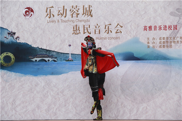 除了一首首生动的乐曲,成都民族乐团艺术家吴峥、夏欢老师近距离为全校师生表演木偶变脸。木偶变脸相较于传统川剧变脸难度更高,它由表演者操纵木偶而展现,精彩的演出引得现场小观众们喝彩声不断,掌声不断。
