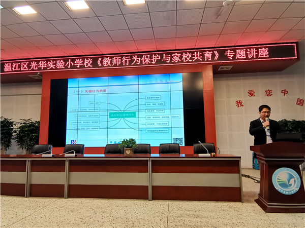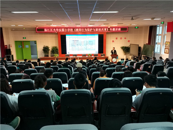 2020年11月13日下午,成都市温江区光华实验小学校特邀法律顾问、四川蓉桦律师事务所合伙人徐伟律师到校,为全体教职工带来了一场以“教师行为保护与家校共育”为主题的法治风控讲座。