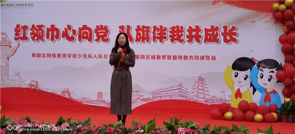 成都市第四区域联盟特教共同体龙头学校青羊区特殊教育学校卞蓉校长发言,她倡导全体少先队员要积极学习,养成良好的行为习惯,祝愿所有学生都能健康快乐成长。
