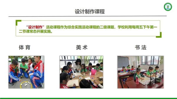 设计制作活动课程作为综合实践活动课程的二级课题,围绕体育、美术、书法开展了三个三级课题。在三段六环课程实施模式下,各类别综合实践活动常态实施,有序开展,真正让课程成为沃土,孕育孩子的生态成长,持续发展。