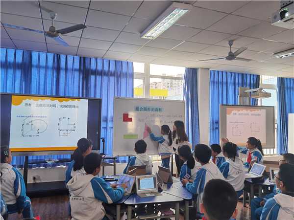 接着,教研员刘艳老师对泡小西区的数学教学工作进行了指导。首先,刘老师特别肯定泡小西区“以学定教”的教学思想。现在的孩子,在学新课前,已经有相当的知识储备,如何顺应学情,让孩子在课堂上展开深度学习,展开思维碰撞,获得更大的收获,泡小西区做得非常好。《组合图形的面积》一课,能尊重学情,层层递进让孩子在讨论中感受到用“割补”法时,要注意观察图形的形状,分析图形的数据特征。同时对年级组单元结构化的想法给予了肯定。