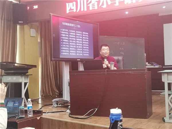 在随后的讲座中,德阳市教育科学研究所教研员冯学敏老师紧扣谢老师的《四季之美》,从“随课微写”的概念辨析、教学策略等方面进行了深入浅出的讲解、分析,尤其是“冯学敏随课微写20例”,令所有参培者如沐春风。