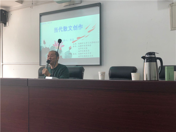 接着,中国当代先锋诗人、思想随笔作家蒋蓝老师带来《当代散文创作》分享。蒋蓝老师创作了《诗歌笔记》(诗集)、《词锋片断》(思想随笔)、《感动香烟》(散文)等20余部个人著作。在2020年5月7日举行的第11届“万松浦文学奖”颁奖暨作品研讨会上,蒋蓝的散文《桶的畅想曲》获得“万松浦文学奖”。