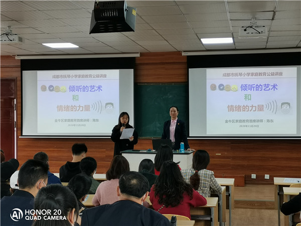 为使广大家长更科学地开展家庭教育,获取新的教育理念,增进学校、教师、家长之间的沟通与联系,促进家校共育。11月20日下午,抚琴小学在琴雅楼四楼多媒体教室召开了以“情绪的力量与倾听的艺术”为主题的家庭教育公益讲座。