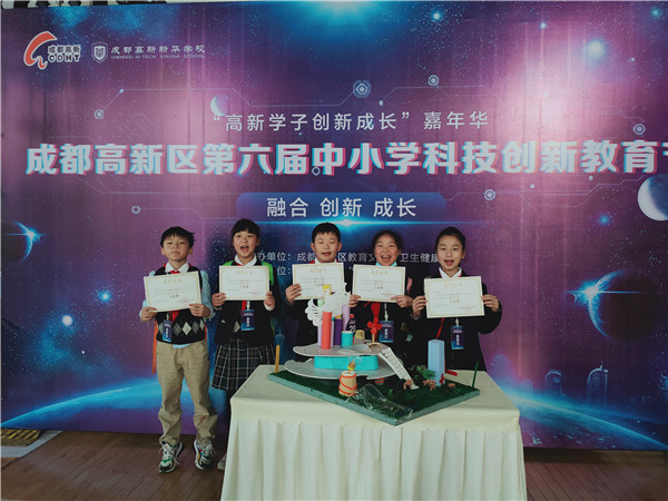 成都高新区新光小学六年级五班韩雨潼、刘芸瑄,五年级二班黄思怡、陈诗洋,五年级六班郭一凡在文燕奇、徐小黎老师的带领下参加了本次创意设计大赛。同学们现场用他们的双双巧手,制作出城市模型,并向大家介绍了模型每个部分的意义和用途。同学们的创意和展示获得了评委们的一致好评,荣获二等奖。