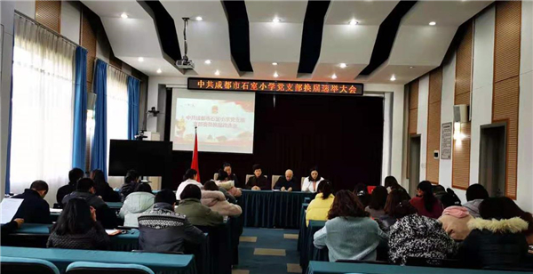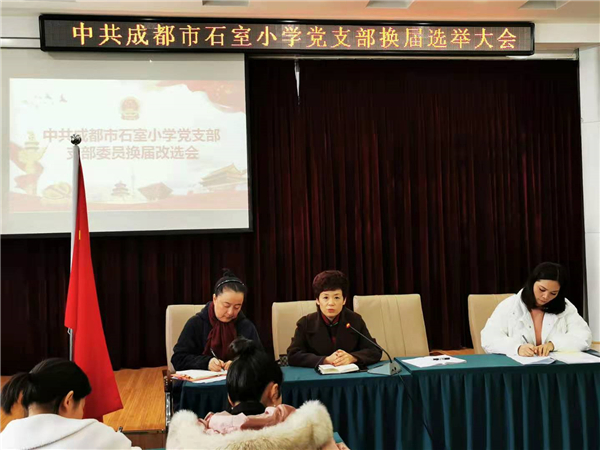 2020年11月23日,中共成都市石室小学支部34名党员同志在学校五楼会议室召开了支部换届选举大会。成华区教育局党组成员、教育考试中心主任张英同志,成华区教育局督导室主任廖勇同志莅临会场,会议由支部副书记周静主持。