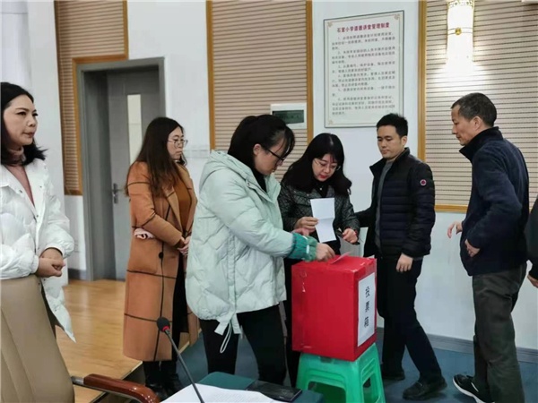 在曾蓉同志宣读了《中共成都市成华区教育系统委员会关于同意中共成都市石室小学党支部开展换届选举的批复》后,周静同志宣读了《中共成都市石室小学支部委员会换届选举办法(草案)》,经到会党员讨论一致通过此选举办法。在检票员蹇秋宇同志、计票员贾先培同志、肖华同志的监督下,按照选举办法,有选举权的32名党员现场进行了无记名差额投票。工作人员现场统票之后,曾蓉、周静、王燕梅、王威力、陈显莉五位同志成功当选石室小学党支部新一届委员。