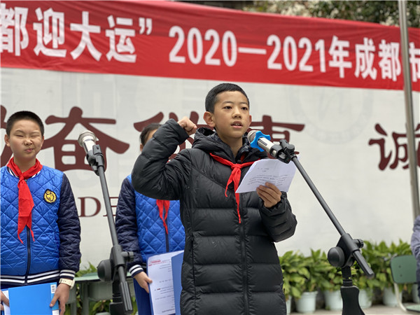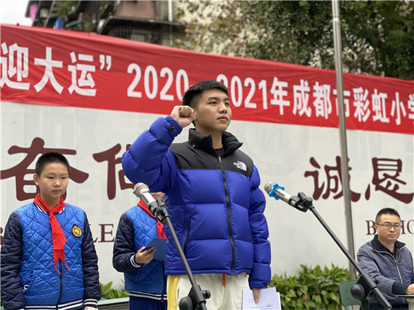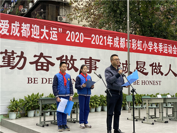 学校裁判员代表和运动员代表做赛前宣誓,气宇轩昂、激情洋溢的誓词更加坚定了运动员们“努力拼搏,不断超越自我”的信心与决心。徐桓副校长致开幕词,鼓励孩子们赛出风格,赛出水平。在全体运动员热烈的掌声中,2020彩虹小学“爱成都·迎大运”冬季运动会正式拉开帷幕。