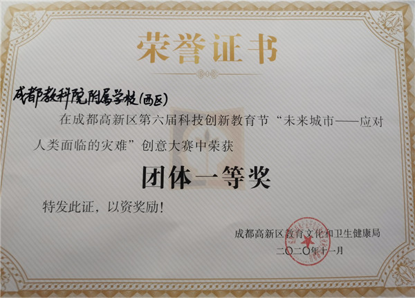 2020年11月20日,成都教科院附属学校(西区)的孩子们参加了由成都高新区教育文化和卫生健康局主办的第六届中小学科技创新教育节活动,并获得了“未来城市——应对人类面临的灾难”创意大赛团体一等奖。