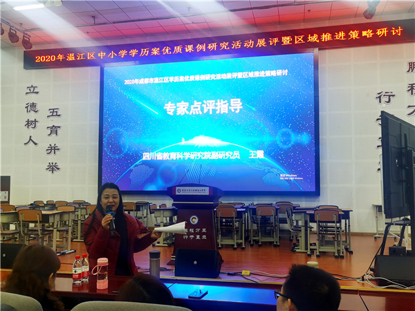 第四项议程专家点评。四川省教育科学研究院副研究员王霞老师首先高度赞扬学历案在课堂中的应用,老师思考的深度与角度转变了,真正实现了用教研促教学的提高,理论在学校的落地。通过老师的教学学生思维呈现螺旋式的上升,思维深入的参与,并且实现多学科的融合。