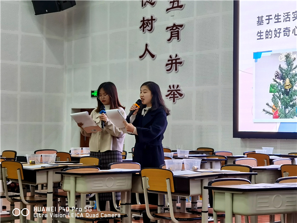 第三项议程课后反思。光华实小科学组的何玲玲和康菊蓉老师以《小学科学学历案课堂学生思维质量与教师理答的关系》为主题进行交流分享。从基于学科特色,选定研究主题;实证研究,量表先行;基于课堂现状,合理变换理答三个方面深度思考,虽然发展性理答和目标性理答对于学生的思维建构会更有效,但作为一名教师,应学会融会贯通,将多种理答方式交汇运用,为学生提供深度学习的机会,促进每位学生“真”学习。