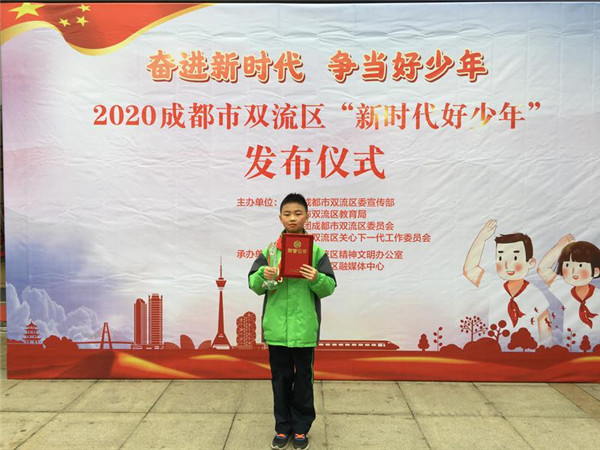 迎春小学六年级五班刘桀荣同学作为2020年双流区“新时代好少年”代表,参加了本次颁奖仪式。2020年初,新冠疫情爆发,在全国为疫情做抗争的时候,品学兼优的他想把自己的零花钱捐给疫区,尽自己的一份微薄之力。在爸爸的帮助下,他的零花钱捐到了慈善机构,并由工作人员统一购买口罩,捐给了双流区东升敬老院、商务局、迎春桥社区、派出所等急需口罩的单位,为抗疫表达了自己的一份心意。