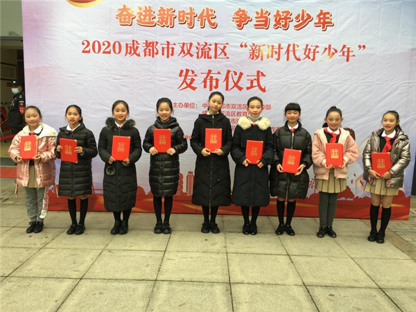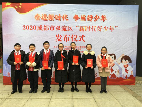 为深入贯彻落实党的十九大报告提出的“培养担当民族复兴大任的时代新人”要求,培育和践行社会主义核心价值观,帮助未成年人“扣好人生第一粒扣子”,持续深化未成年人思想道德建设,2020年11月29日,双流区文明办、区教育局和团区委在双流区志愿者服务中心隆重举办2020年双流区“新时代好少年”主题宣讲暨颁奖仪式。成都市双流区东升迎春小学受主办方特别邀请,参加了颁奖仪式小礼仪、朗诵节目表演。