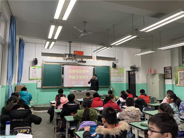 各班分别围绕本次活动的主题开展了系列班级活动。包括晨读宪法、创办法治小报,年画社团的同学们以“法治在心中”为主题进行了年画创作,活动形式丰富多彩。学校也设立了“学宪法 知宪法 讲宪法”宪法晨读分会场,组织各班学生代表观看并学习教育部宪法晨读活动。各班中队辅导员利用班队会带领同学们一起进行宪法晨读活动,师生共396人,全员参与。本次活动形成尊重宪法、宪法至上、用宪法维护人民权益的社会氛围。