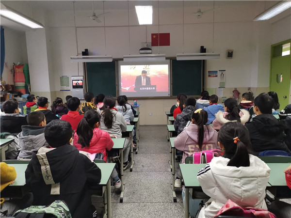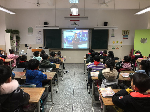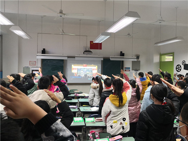 观看直播后,老师们又和学生一起读宪法。在老师介绍国家开展宪法日活动基本情况后,师生开始集体朗读。所有人情绪激昂,大声跟随诵读,用心体会宪法的庄严与神圣。