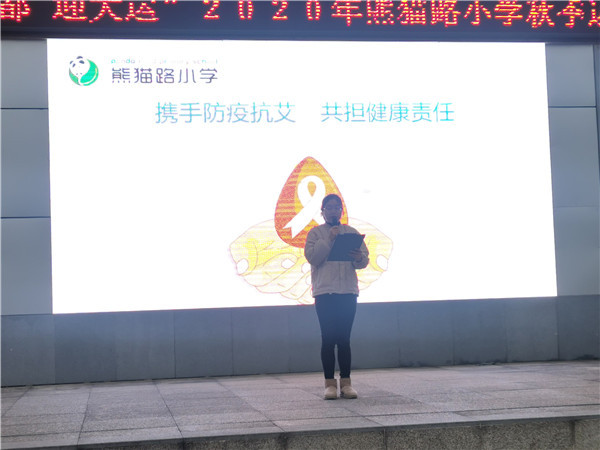 近日,成都市熊猫路小学开展了防疫抗艾和宪法宣传教育活动。2020年11月30日,在学校升旗仪式上,龚俊辉老师进行了以“携手防疫抗艾,共担健康责任”为主题的国旗下讲话,号召同学们珍爱生命,关爱他人。