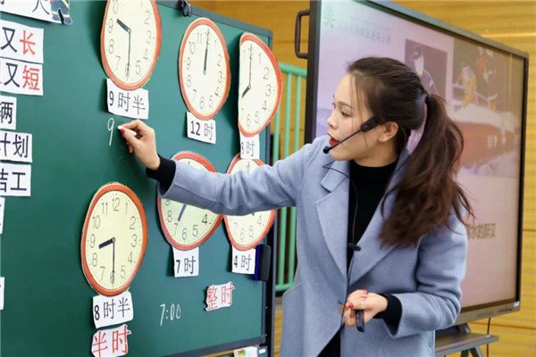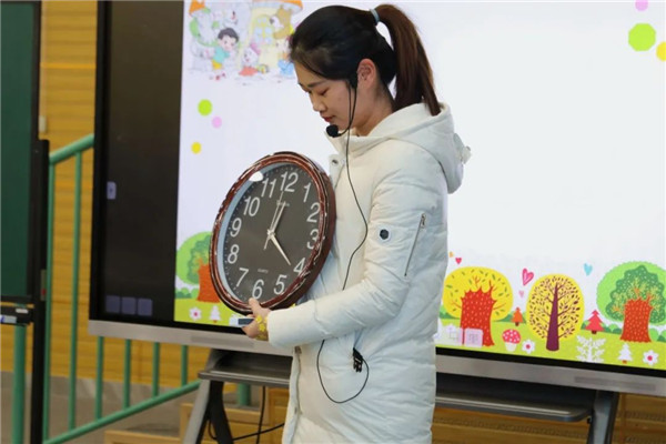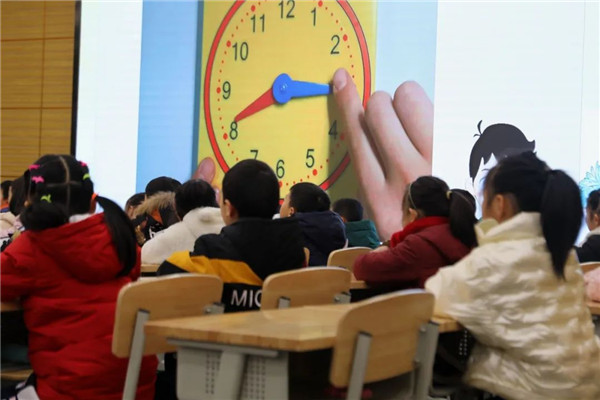 第三节是由双流区实验小学外国语学校张若男老师执教的《认识时钟——小明的一天》。本节课与第一节课同样是教孩子们认识时钟,但同课异构,张老师从孩子们的生活实际切入,利用同龄人“小明”一天的作息时间,引导孩子们逐步认识时钟,并用丰富的学具让孩子们自己动手分类,归纳总结出整时与半时的认识要点。