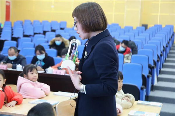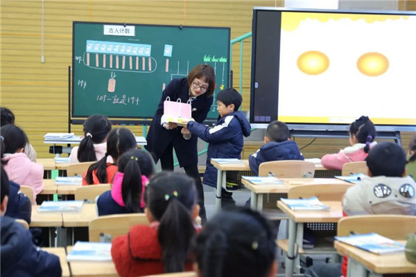 第二节是由双流怡心第一实验学校李沙沙老师执教的《古人计数》。李老师由“古人养羊是如何统计羊的数量”这个问题引发孩子们的思考,引导孩子自己用小棒学习由个位的计数到十位的计数,再从小棒过度到使用计数器拨珠子,帮助孩子们顺利解决从具体到抽象的计数方法。