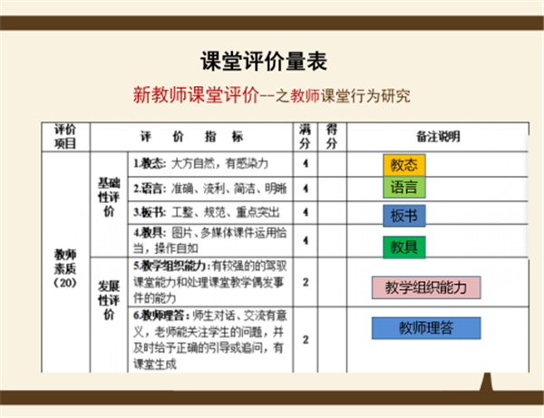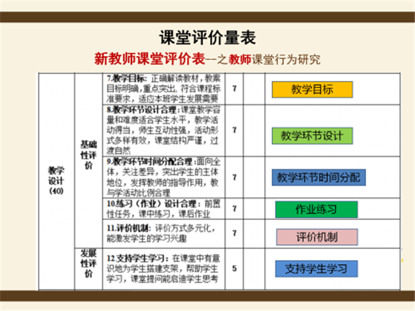 课题组关注新老师的发展需求,围绕教师和学生量身打造课堂教学评价量表。课堂评价量表从两个方面来观察、评价新老师的课堂。一是教师课堂行为研究;二是学生课堂行为研究。意图通过观察学生的课堂表现,反观教师的课堂活动设计是否合理有效。