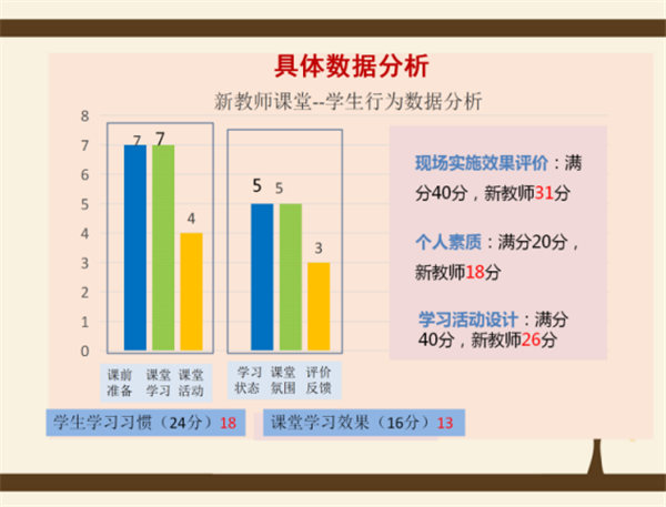 针对分析,研究团队帮助新教师聚焦要点,理解一堂好课的标准,号召新教师不仅要在个人素质的不断提升上下功夫,还需在课堂教学中强化以学生为本的意识,以学习活动的设计为主,追求真实、有效、有趣的课堂教学。