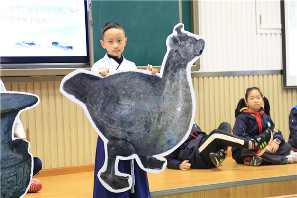 四年级三班的十位学生分别扮演重庆中国三峡博物馆十大镇馆之宝依次向草小西区师生介绍了自己。他们高举文物卡,用最童真的语言、最真挚的感情,向大家展示文物的历史和价值。
