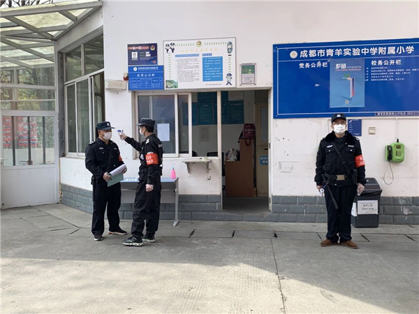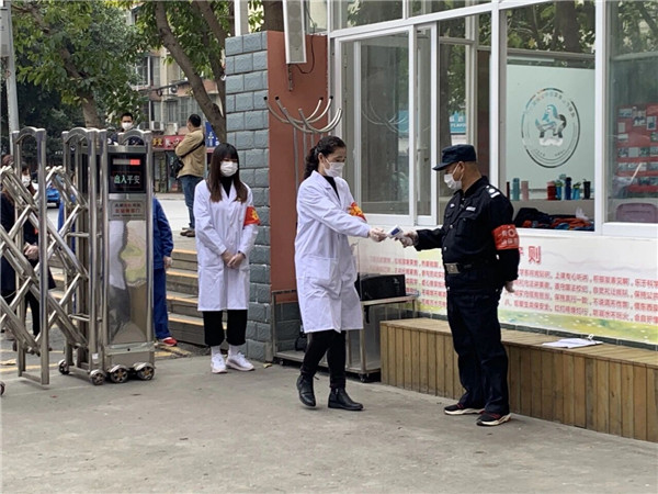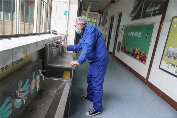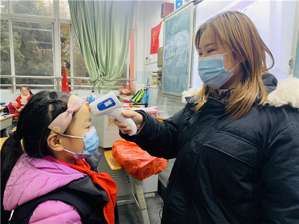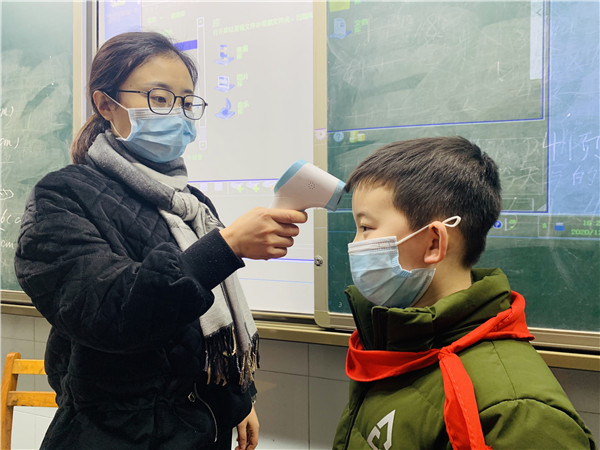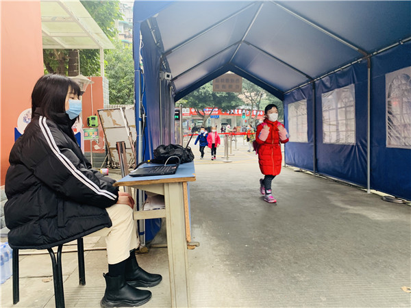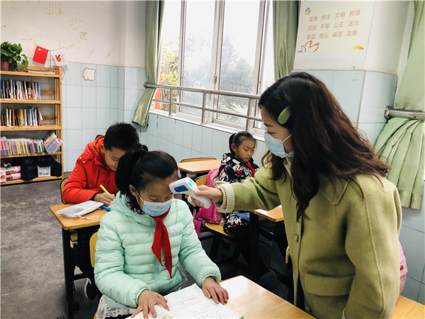 每日清晨,卫生保健室的老师都会守在学校大门口,检测每位入校师生的体温,守好安全防疫第一道防线。