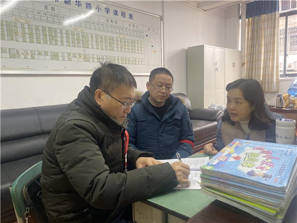潘绍茂督学首先听取学校分管教学副校长廖娟就学校根据学生学情、差异、分层作业的减负举措汇报,并随机查看了4、5年级学生的作业批改情况。随后,分管安全副校长王智和后勤主任郑春林向潘老师详细阐述了学校疫情防控常态化的工作情况以及学校安全工作等,就疫情防控实施以来的各项具体措施、人员配备、物资管理等方面做了全面介绍。最后,潘老师走进教室,与学生代表进行了交流、沟通,细致询问了同学们的课业情况,了解学校是否落实减负措施。同时,还在肯定学校所做工作的基础上,对检查过程中发现的问题,与学校交换了意见,并给予了切实可行的改进措施。