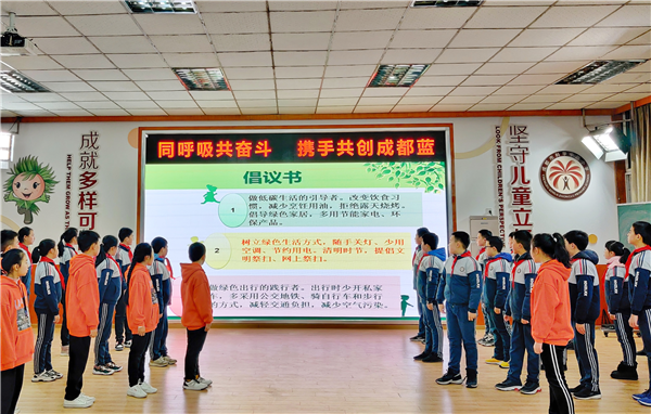 活动最后,同学们向全校师生发出倡议:做低碳生活的引导者,树立绿色生活方式,践行绿色出行。倡导“大气保护从小事做起,绿色生活从身边开始”,新时代的小学生要做环境保护的宣传者和践行者,积极参与环保公益活动,宣传绿色生活知识,用实际行动影响身边的每一个人。让我们同呼吸共奋斗,携手共创成都蓝!