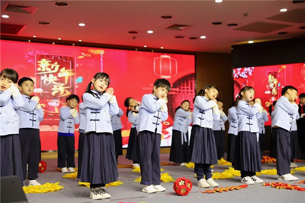 “写好中国字,做好中国人。写字要用心,做人要真诚。中华大家庭,四海皆同心。写好中国字,做好中国人。”美妙的歌声飘来了,一(1)班的孩子们穿着汉服,脸上洋溢着节日的喜悦,给老师和同学们送来了新年的祝福。中国结、鞭炮、大红气球、春联、窗花……整个舞台显示出浓郁的节日气氛。