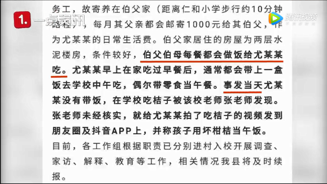 1月6日,广西桂林一段小学生在学校吃柑橘当午饭的视频引发关注。阳朔县宣传部发布通报称,视频中的小女孩父母已离异,其跟随父亲生活,不是建档立卡贫困户学生。因其父亲长期在外地务工故寄养在伯父家。伯父伯母每餐都会给她做饭,通常也会带饭去学校。事发当天女孩没有带饭,张老师未经核实,就拍摄视频称孩子用坏柑桔当午饭。目前,各工作组已进村入校开展调查工作。