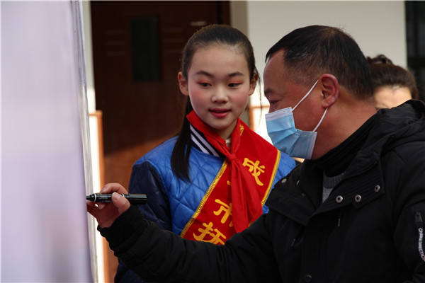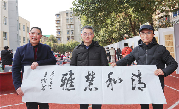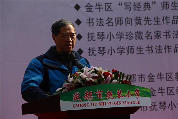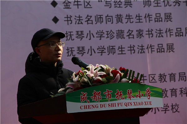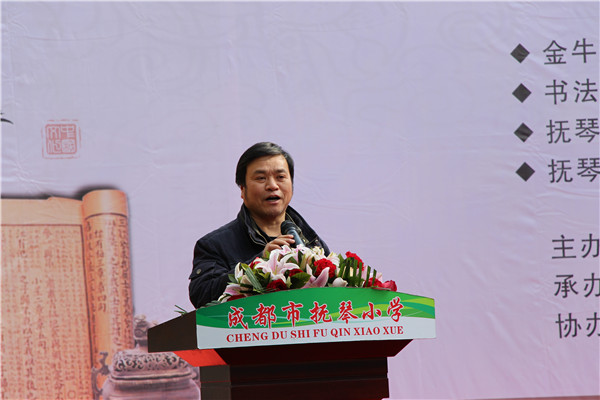 成都市抚琴小学校长邱伯成致欢迎辞。“笔墨挥洒青春,少年传承瑰宝。”邱校长对来宾的到来表示最热烈的欢迎,并介绍了抚琴小学人人写书法的传统。